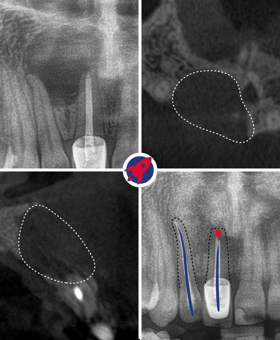 In a patient with a pronounced infection and a cyst in the anterior region, X-rays and CBCT showed the extent of the findings. We performed root canal treatment on the lateral incisor and root tip resection on the previously treated central incisor. The root tip and cyst were removed and the canal was filled from the tip (marked in red). The stable result is still visible eight years after treatment.
